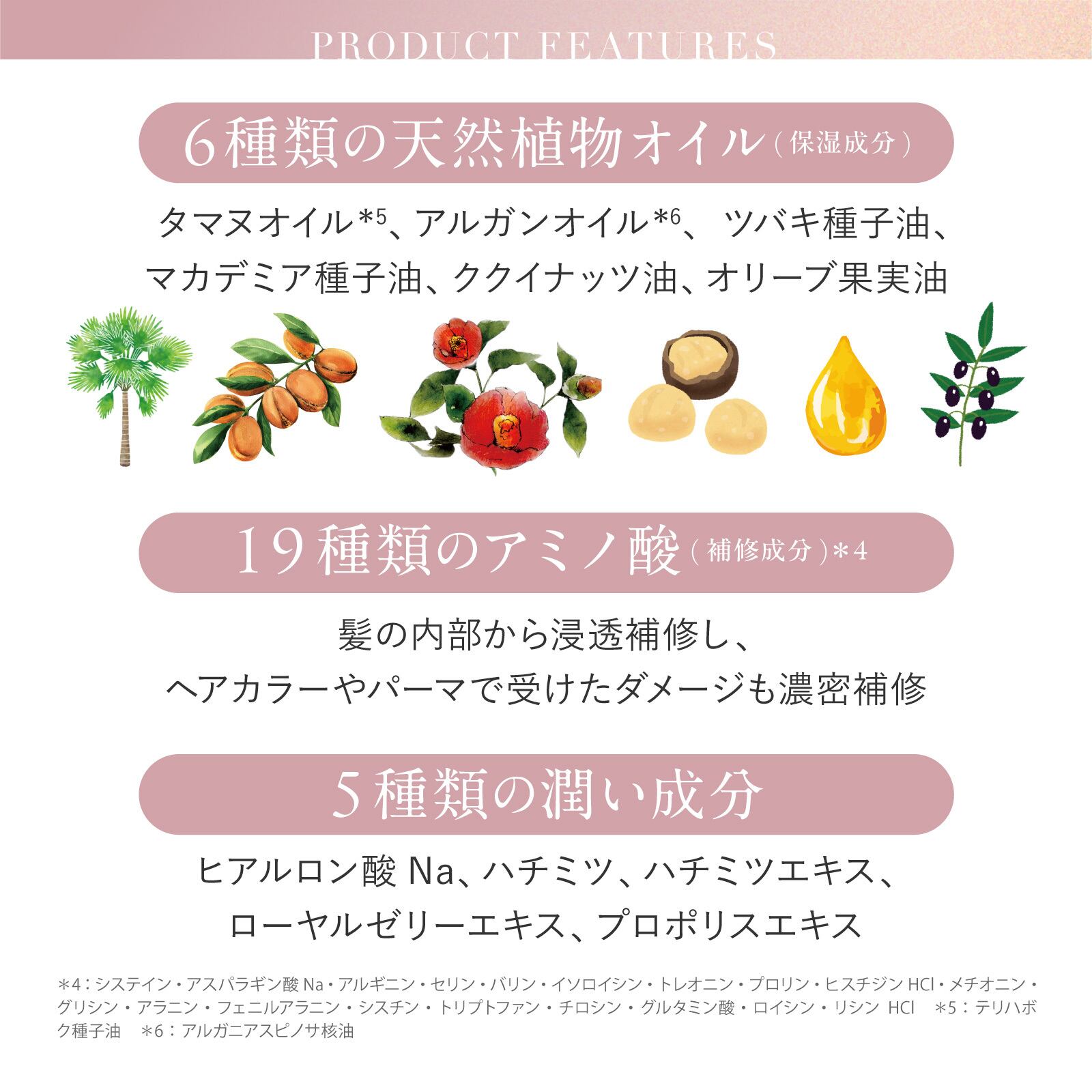 水、セタノール、グリセリン、アモジメチコン、ステアリルアルコール、シクロペンタシロキサン、ドデカン、ベヘントリモニウムクロリド、レブリン酸、加水分解ケラチン(羊毛)*¹、マカデミア種子油、セラミドNG、ヒアルロン酸Na、ハチミツ、ハチミツエキス、ローヤルゼリーエキス、プロポリスエキス、トリ(カプリル酸/カプリン酸)グリセリル、(ラネスー40マレイン酸Na/スチレンスルホン酸)コポリマー、ヤシ油アルキルグルコシド、ツバキ種子油、ククイナッツ油、オリーブ果実油、アルガニアスピノサ核油、オウゴン根エキス、ワレモコウエキス、メドウフォームエストリド、(ジヒドロキシメチルシリルプロポキシ)ヒドロキシプロピル加水分解ケラチン(羊毛)*²、(ジヒドロキシメチルシリルプロポキシ)ヒドロキシプロピル加水分解シルク*²、加水分解コラーゲンPGプロピルメチルシランジオール*²、トコフェロール、システイン*、アスパラギン酸Na*、アルギニン*、セリン*、バリン*、イソロイシン*、トレオニン*、プロリン*、ヒスチジンHCl*、メチオニン*、グリシン*、アラニン*、フェニルアラニン*、シスチン*、トリプトファン*、チロシン*、グルタミン酸*、ロイシン*、リシンHCl*、タウリン、クエン酸Na、白金、γ―ドコサラクトン、アラントイン、イノシン酸2Na、グアニル酸2Na、ラウロイルグルタミン酸ジ(フィトステリル/オクチルドデシル)、クオタニウムー18、クオタニウムー33、ジココジモニウムクロリド、ジヒドロキシプロピルアルギニンHCl、イソプロパノール、ステアルトリモニウムブロミド、PG、BG、ジパルミチン酸アスコルビル、ステアルトリモニウムクロリド、ポリオレイン酸スクロース、コレステロール、セテスー20、乳酸、ソルビン酸K、エタノール、カラメル、ジメチコン、ジメチコノール、オレイルアルコール、フェノキシエタノール、メチルパラベン、プロピルパラベン、香料