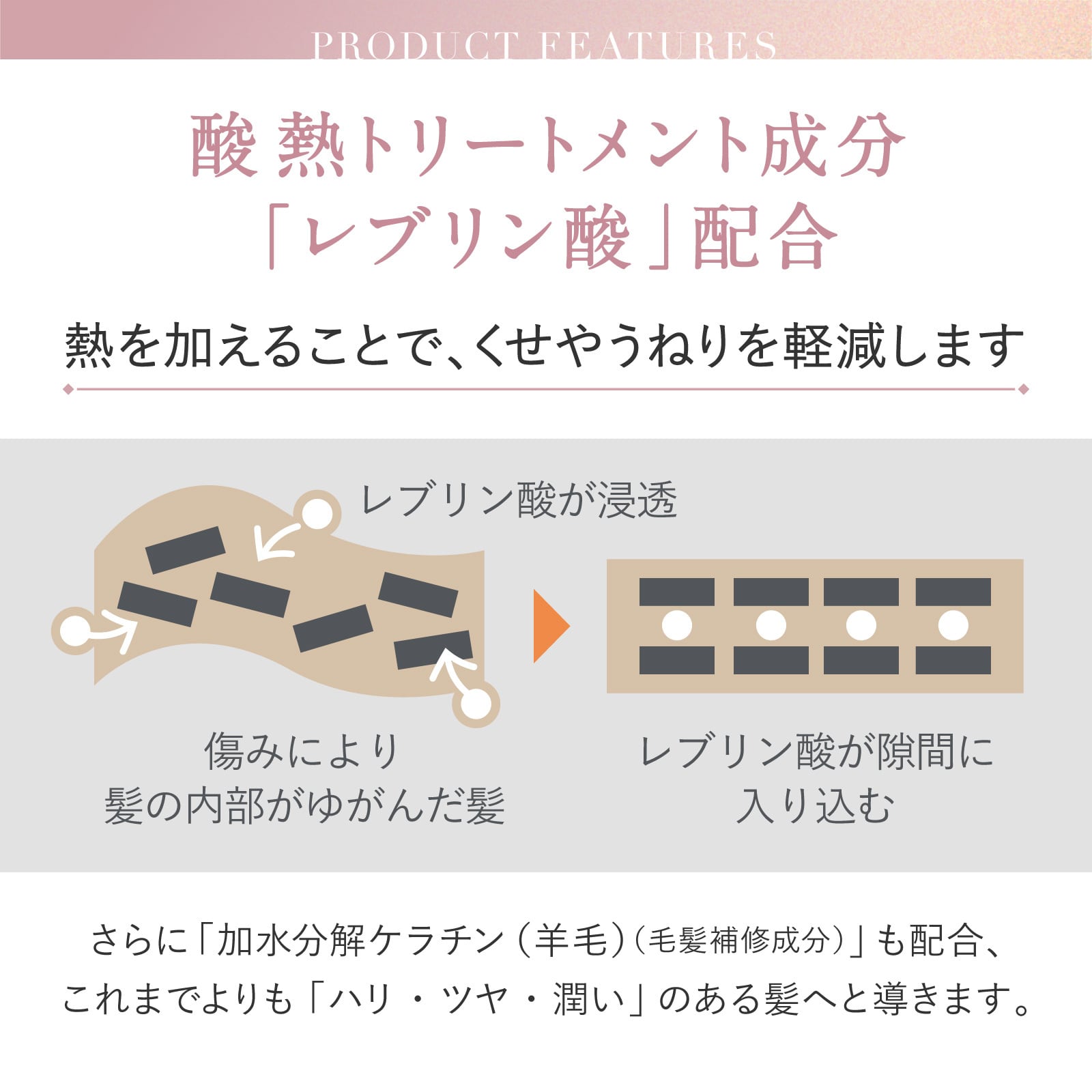 ドライヤーの熱で補修する「トリプルヒートリペア処方」で髪を高密着補修。さらに、今回のリニューアルで「レブリン酸(酸熱トリートメント成分)」「加水分解ケラチン(羊毛)(毛髪補修成分)」を配合しました。これまでよりもダメージやダメージによるうねりを抑え、「ハリ・ツヤ・潤い」のある髪へと導きます。ほかにも19種類のアミノ酸、酸熱トリートメント成分、毛髪補修成分を配合。髪に必要な水分を保持・調整し、ダメージを補修します。